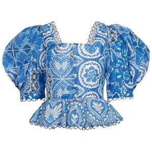 This FARM Rio blouse features vibrant blue floral prints and playful puff sleeves, evoking a cheerful and bohemian vibe. Pair it with neutral bottoms, like the model's white skirt, for a balanced yet eye-catching look.