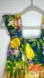 Vibrant dress with tropical vibes. Features a mix of green, yellow, orange, and pink colors.