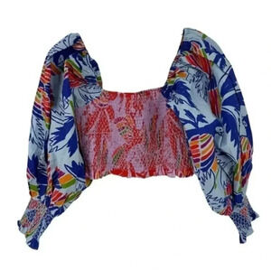 FARM RIO Farm Rio Mixed Birds Puff-Sleeve Smocked Crop Top B1103