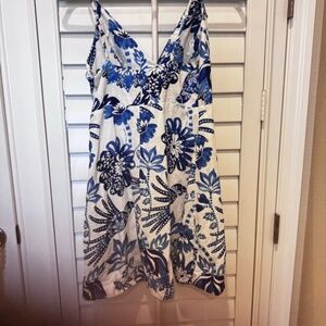 FARM RIO Floral Birds Off-White Sleeveless Cobalt Blue & white.