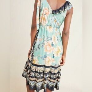 Embrace elegance with this floral one-shoulder dress. The vibrant design features a mix of teal and floral patterns, perfect for any occasion. The Farm Rio Anthropologie is a knee-length wrap dress with a V-neck neckline and one shoulder strap. It features a ruffle and strappy sleeve type, an elastic waist, and contrasting trim accents. The dress is made of viscose fabric.