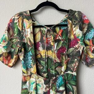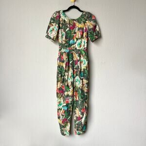 FARM RIO Garden Dreams multicolor tropical motif jumpsuit. Plain weave fabrication. Pleated at waist. Adjustable tie at back with open back design. Beaded ties. Ankle length. Hidden zip at back. Slant hip pockets. Partially lined. In great condition. Size XS - 16" pit to pit; 13" waist; 25" leg inseam; 11.75" leg opening.