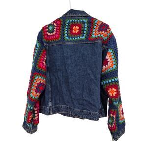 FARM RIO MEDIUM CROCHET SQUARE GRANDMA BOHO BUTTON UP LONG SLEEVE JEAN JACKET