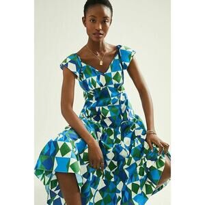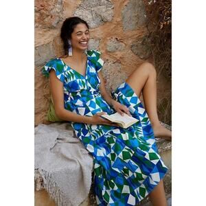 FARM RIO Medium Tiered Maxi Dress Carmelita Geometric Blue Green Ruffle