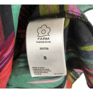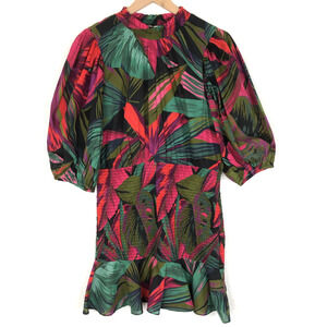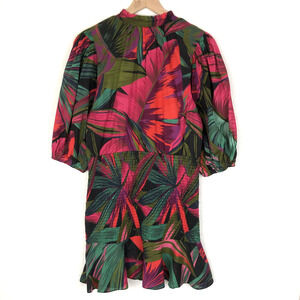 This FARM RIO Midnight Leaves Mini Dress in size Small is a colorful and vibrant piece perfect for summer, fall, and spring occasions. Made of 100% cotton woven fabric, this dress features a striking pattern, 3/4 puff sleeves, and a mock neck smocked neckline, bodice, and cuffs. Side zip.