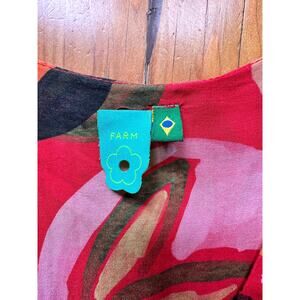 Beautiful Farm Rio dress from Brazil (pattern not found in US). Button front with fun open part and small high/low detail at bottom with ruffles. Women's small, with good stretch around middle.