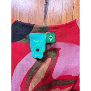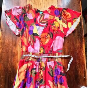 Beautiful Farm Rio dress from Brazil (pattern not found in US). Button front with fun open part and small high/low detail at bottom with ruffles. Women's small, with good stretch around middle.