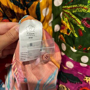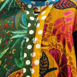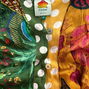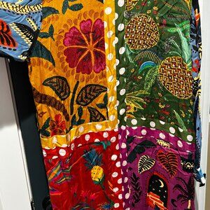 Vibrant long sleeve dress by FARM Rio. Features a mix of bold patterns and colors. Button-down front with a playful design.