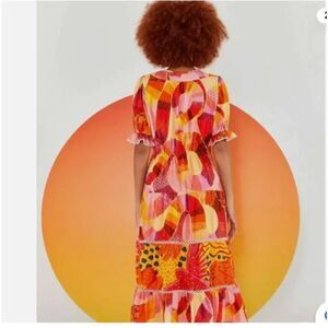 FARM RIO Patch Twirl Midi Dress Puff Sleeve Sz M Multicolor Drawstring Tie Neck