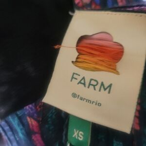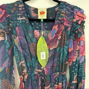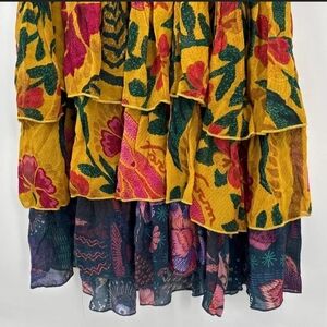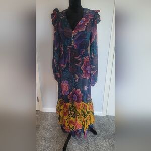 Iconic Farm Rio Dress with colorful intricate details and a tiered ruffled bottom.