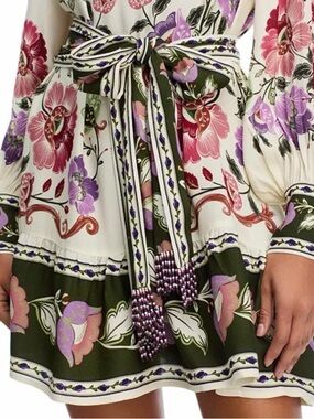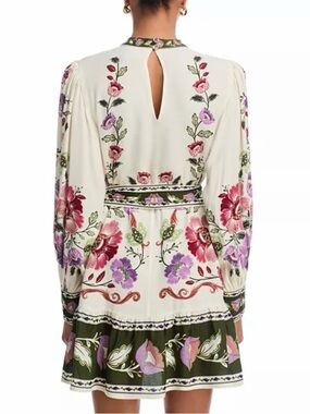 Elevate your wardrobe with this ivory floral mini dress. Features a tied waist for a flattering silhouette. Long puff sleeves and a high neckline add polished detail. Vibrant pink and purple floral print on an ivory background. Lightweight and feminine for daytime or special occasions.