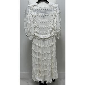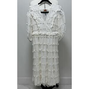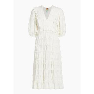 FARM RIO'S PUFF-SLEEVE MIDI-DRESS IS DECORATED WITH RUFFLED DETAILING AT THE BODICE AND TIERED, TONAL EMBROIDERY