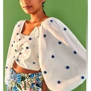 FARM RIO White Floral Embroidered Crop Top Blouse Cotton Puff Sleeve Medium EUC
