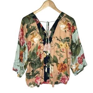 Women’s Kimono Sleeve Tassel Tie Back Vneck Mixed Floral top