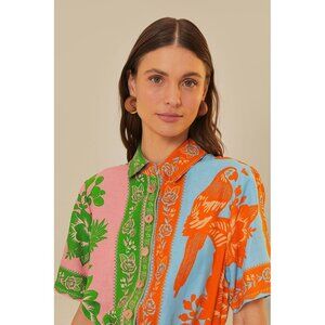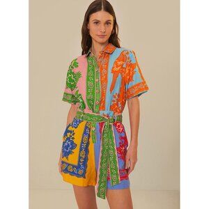 Revel in the charm of its collar neckline and the vibrant tapestry of floral and avian patterns adorned with delicate lace-like detailing. This romper boasts a cinched, tie waist for a flattering silhouette, while the color-blocked design and bold hues capture the essence of playful sophistication.