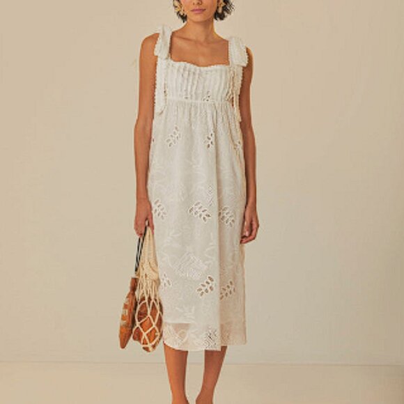 * This enchanting piece features feminine eyelet embroidery that dances across a delicate off-white fabric. With its square neckline and charming ruffle-trimmed straps.