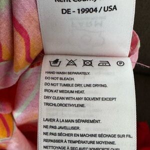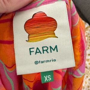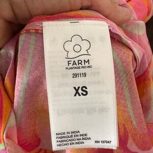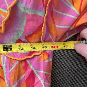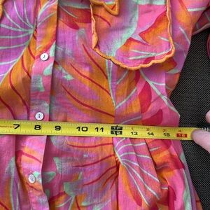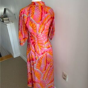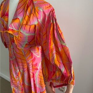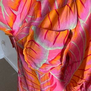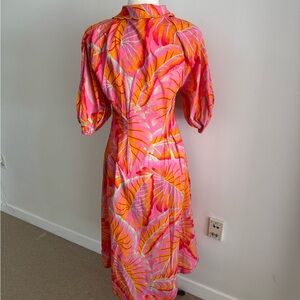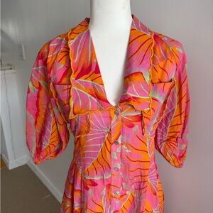 Stylish dress with a vibrant pink and orange leaf print. Features a button-down front and puff sleeves. Worn a few times and in very good condition