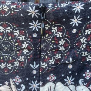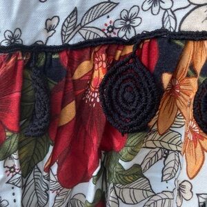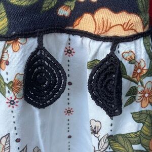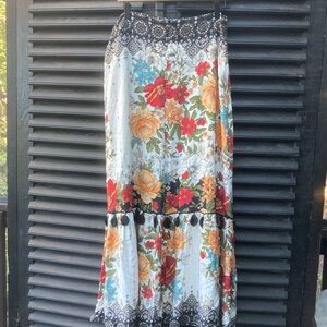 Farm Rio Anthropologie Maxi skirt back zipper with black embroidered details in very good condition 19” waist 40” length 22” front slit