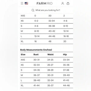 **Farm Rio measurements included from website, based on bust measurements, I would estimate this cardigan/jacket to range in the XS-S size.