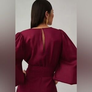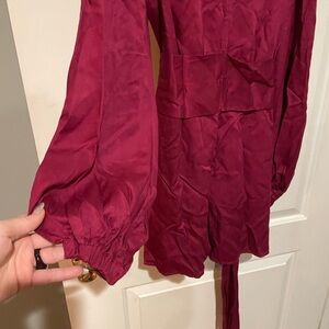 Elegant burgundy romper with a deep V-neck. Features long, flowing sleeves and a waist tie. Perfect for stylish occasions.