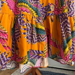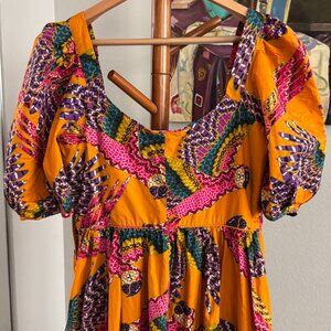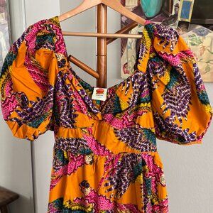 Flaunting voluminous puff sleeves, this midi dress fits and flares from the sweetheart neckline to the high-low hemline.