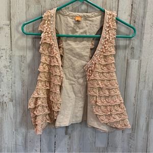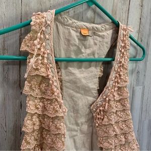 Elegant sleeveless top with lace ruffles. Soft beige color. Perfect for layering.