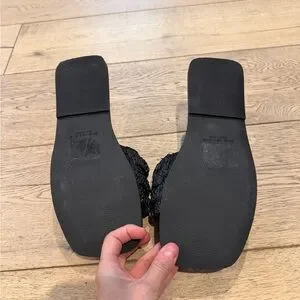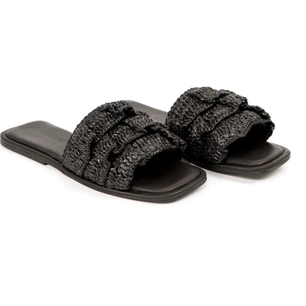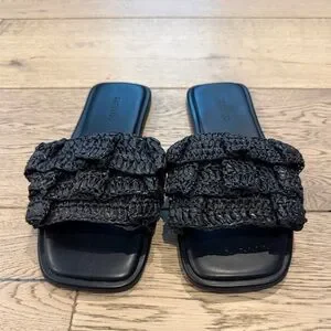 Stylish slide sandal with layered crochet ruffles. Soft footbed for easy wear. Slip-on design for quick, casual looks. Feminine texture adds visual interest.