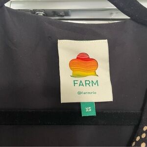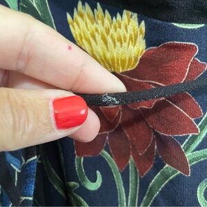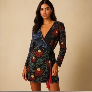 This is a stunning Farm Rio wrap dress. It is black, long sleeved, with a floral design. At the bust there is a small eyelet hook. The dress is lined, is 100% viscose and the tassels are beaded for an extra accent! There is the smallest imperfection on the tie, I had not noticed it until I was taking the photos but otherwise the dress is perfection!