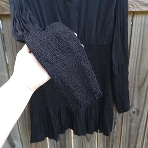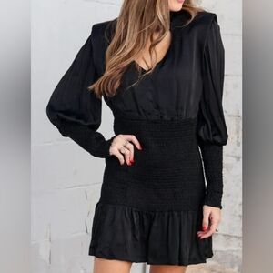 Elegant black mini dress. Features puff sleeves and fitted waist. Perfect for any occasion.