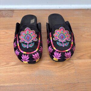 EUC; Farm Rio Black Velvet Tapestry Clog Mules