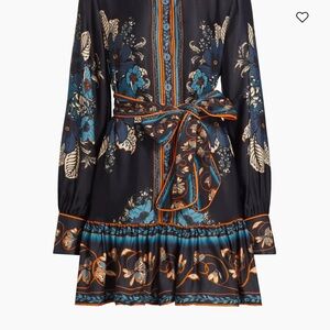 Elegant mini dress with floral pattern. Features a tie waist and button details. Perfect for any occasion.