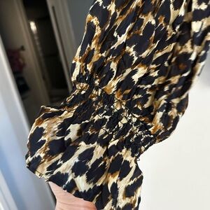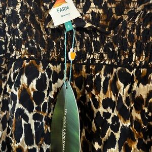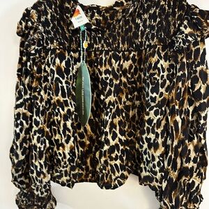 This chic blouse from FARM Rio features a striking leopard print in black and brown, complemented by ruffled and smocked detailing around the neckline. The long sleeves end in gathered, ruffled cuffs, adding a touch of elegance to its cropped silhouette. Perfect for a fashion-forward look, this lightweight top is both stylish and versatile.