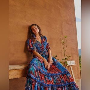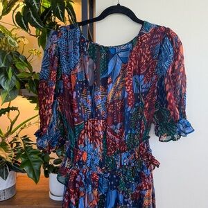 Excellent used condition. Size zipper (but honestly easier just to slip on). Tiered ruffle maxi dress. Sheer sleeves. Waist area has elastic so more forgiving fit. Gorgeous and rich blue / brown tones with leopard 🐆 print.