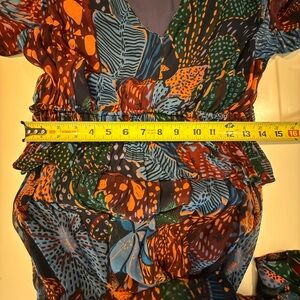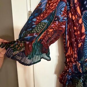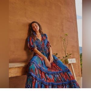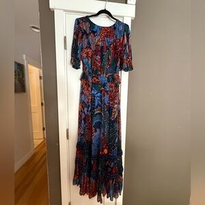 Excellent used condition. Size small. Has a zipper but can be pulled on as waist has elastic. Tiered ruffle maxi dress. Sheer sleeves.