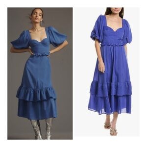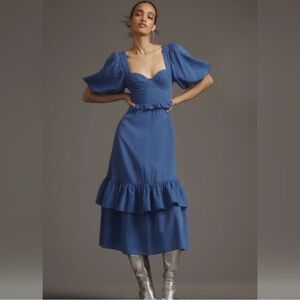 FARM Rio Blue Ruffled Tiered Midi Dress with Puff Sleeves