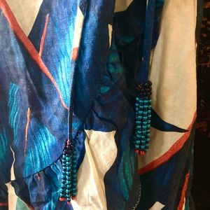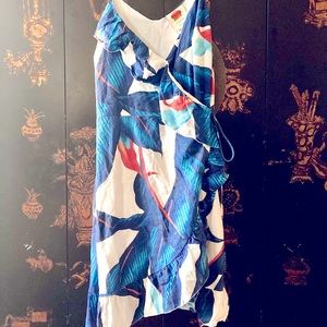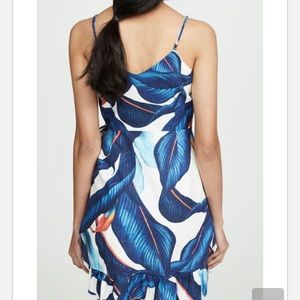 Vibrant tropical print mini dress by FARM Rio. Spaghetti straps and ruffle details. Flowy A-line silhouette. Lightweight, breezy fabric. Bold blue leaf motif with white background and orange accents.
