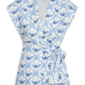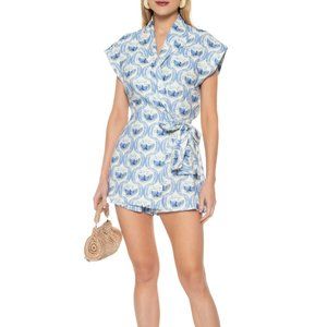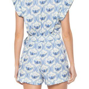 Stylish romper with a blue and white pattern. Features a wrap design and short sleeves. Perfect for casual outings.
