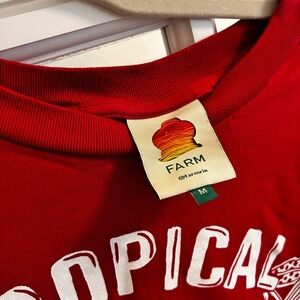 Bright red tee with bold white lettering. FARM Rio label detail.