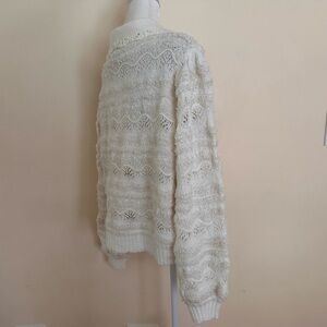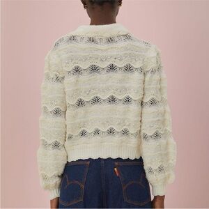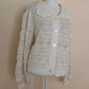 • This collared cardi knit from cozy wool-kissed yarn features a dreamy mix of stitches that results in a harmonious tapestry of dimension and texture.