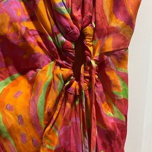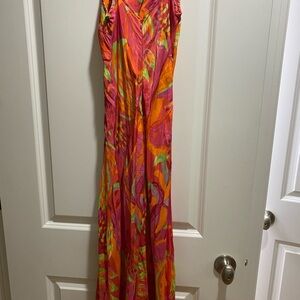 Vibrant maxi dress with abstract patterns. Features bold pink, orange, and green tones. Ideal for making a statement.