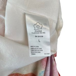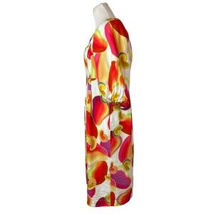 Vibrant midi dress with abstract pattern. Features puff sleeves. Perfect for a bold statement.