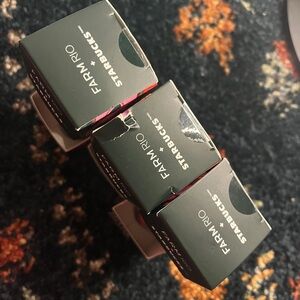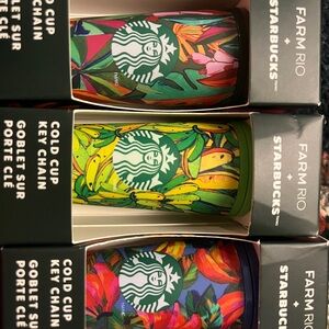 Vibrant key chains with tropical designs. Features FARM Rio and Starbucks branding. Perfect for adding flair to your keys.