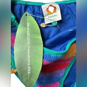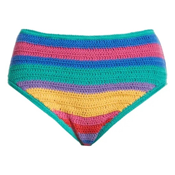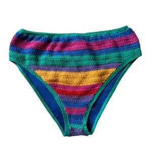 Bright crochet bikini with vibrant stripes. Perfect for beach fun.