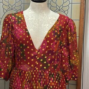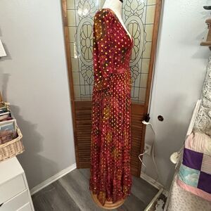 FARM Rio Banana Flowers Maxi Dress Metallic Red Gold V-neck size M in good condition. missing belt and button, please see photos! Small rip in lining where it connects under the bust which you can’t see from the outside, just take note!