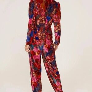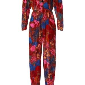 Bold jumpsuit with floral patterns. Features a deep V-neck and long sleeves. Perfect for a standout look.