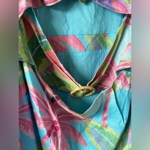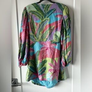 Vibrant mini dress with floral pattern. Features a mix of pink, green, and blue. Elegant design with a stylish belt detail.