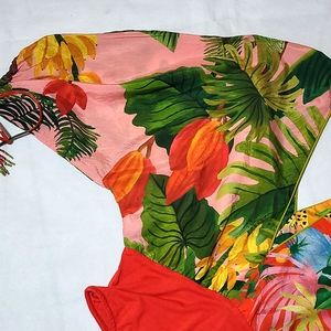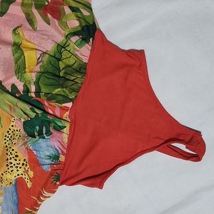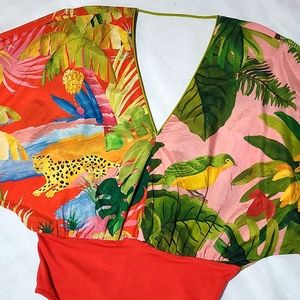Bold jungle print with deep V-neck. Long sleeves and vibrant design.