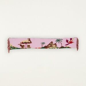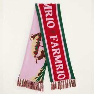 Charming scarf with pink and green hues. Features FARM Rio branding and playful patterns.