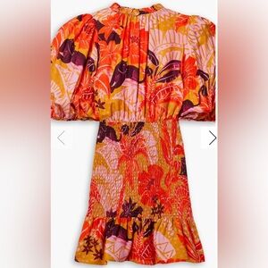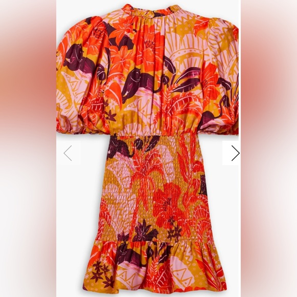 Jungle Panther Mini Dress In Jungle Panther. Vibrant mini dress with bold patterns. Features puff sleeves and a ruffled hem. Perfect for a statement look.