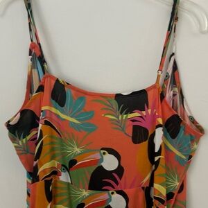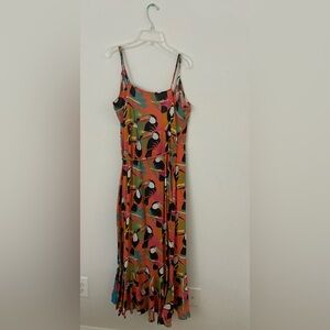 Vibrant midi dress with a mix of colors. Features a sleeveless design and a flowing silhouette. Perfect for a bold statement.
